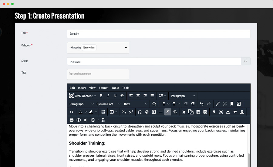 Stay organized with category grouping. Presentations are neatly categorized, making it easy to find the specific type of content you're looking for, whether it's boxing techniques, fitness routines, or nutrition advice.